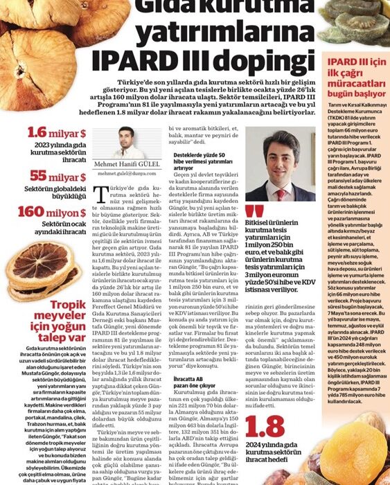 5 Nisan 2024 Dünya Gazetesi HaberiTürkiye’de son yıllarda gıda kurutma sektörü hızlı bir gelişim gösteriyor. Bu yıl yeni açılan tesislerle birlikte ocakta yüzde 26’lık artışla 160 milyon dolar ihracata ulaştı. Sektör temsilcileri, IPARD III Programı’nın 81 ile yayılmasıyla yeni yatırımların artacağı ve bu yıl hedeflenen 1.8 milyar dolar ihracat rakamın yakalanacağını belirtiyorlar.Türkiye’de gıda kurutma sektörü...