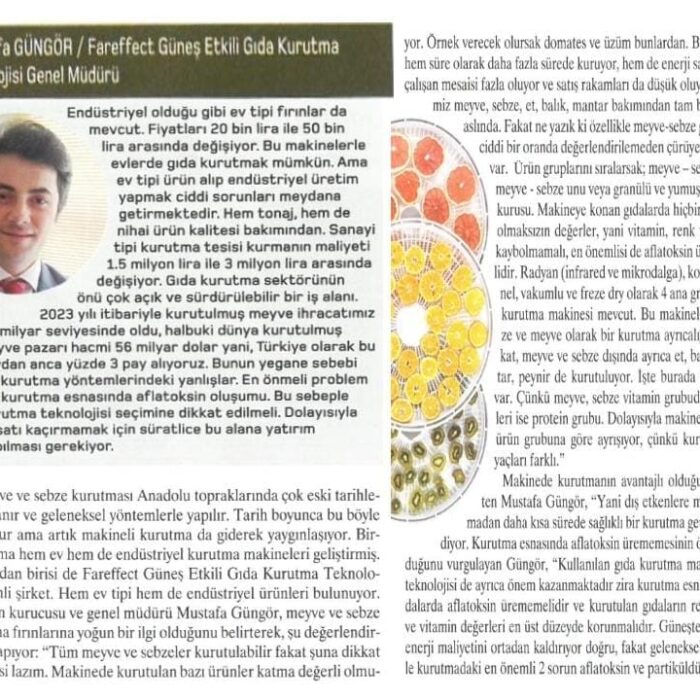 Mustafa GÜNGÖR Fareffect Güneş Etkili Gıda Kurutma Teknolojisi Genel Müdürü Endüstriyel olduğu gibi ev tipi fırınlar da mevcut. Fiyatları 20 bin lira ile 50 bin lira arasında değişiyor. Bu makinelerle evlerde gıda kurutmak mümkün. Ama ev tipi ürün alıp endüstriyel üretim yapmak ciddi sorunları meydana getirmektedir. Hem tonaj, hem de nihai ürün kalitesi bakımından. Sanayi...