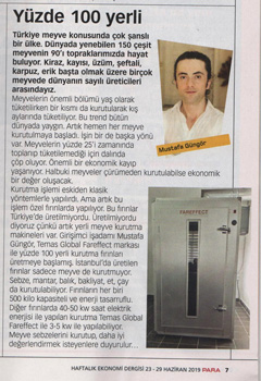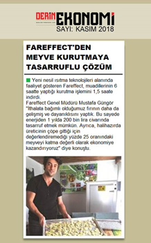 Kurutulmuş Meyve 5 Kat Yüksek Bedelle SatılıyorFareffect, İhracata Odaklandı Fareffect, yürüttüğü Ar-Ge çalışmaları neticesinde geliştirdiği Fareffect gıda kurutma makinesi ile ihracattaki iddiasını arttırdı. Fareffect genel müdürü Mustafa Güngör Azerbaycan Gana, Gabon, Lübnan, Bulgaristan, Rusya, Almanya, Kazakistan, ve Liberya gibi ülkelerden gelen firmalarla makinemiz ile ilgili görüşmelerimiz sürüyor dedi gıda kurutma makineleri ile ilgili 2019 yılında...Devamını Oku