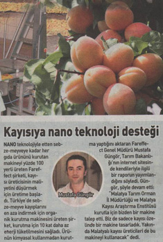 KAYISIYA NANO TEKNOLOJİ DESTEĞİ Nano teknolojiyle etten sebze- meyveye kadar her gıda ürününü kurutan makineyi yüzde 100 yerli üreten Fareffect şirketi, kayısı üreticisinin maliyetini düşürmek için üretime başladı. Türkiye’de sebze- meyve kayıplarını en aza indirmek için organik kurutma makinesini üreten şirket, kurutma için 10 kat daha az enerji tüketilmesini sağladı. Ürünün kimyasal kullanmadan kurutma yaptığını...Devamını Oku